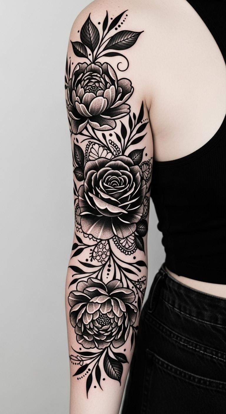 This sleeve concept centers on a sweeping arm composition that begins at the shoulder with large, open peonies and cascades into layered roses, lilies, and wildflowers wrapping the bicep and forearm, interspersed with delicate vines and filigree.