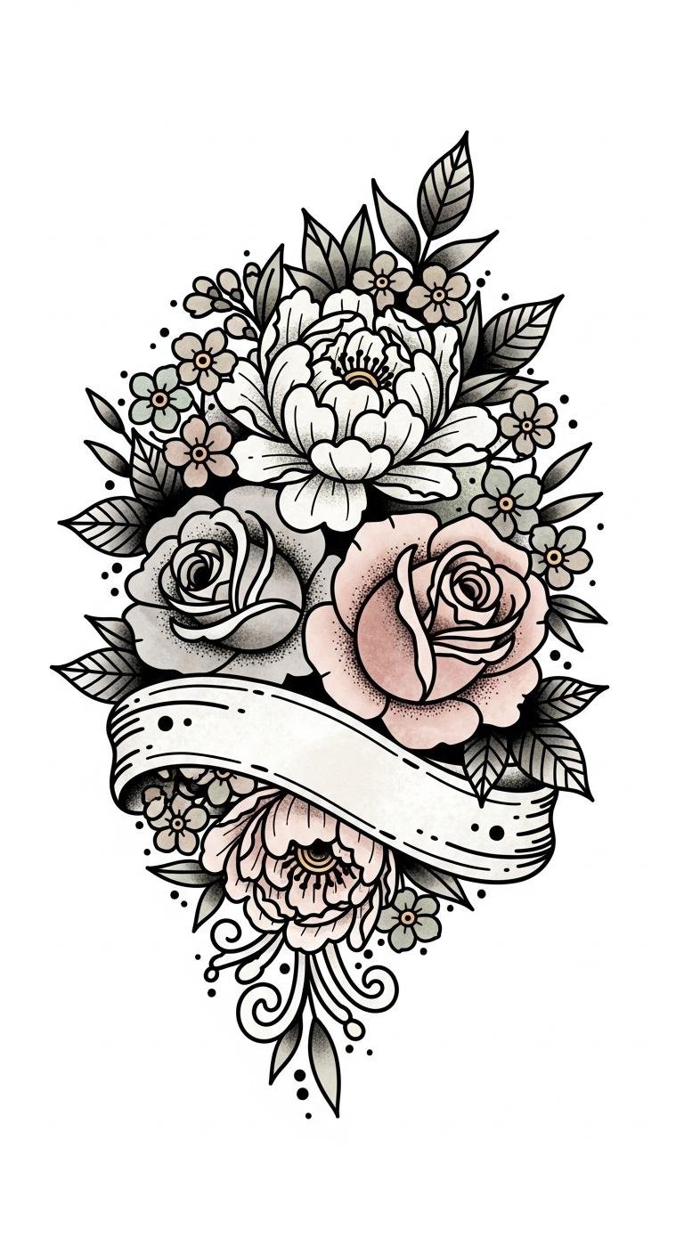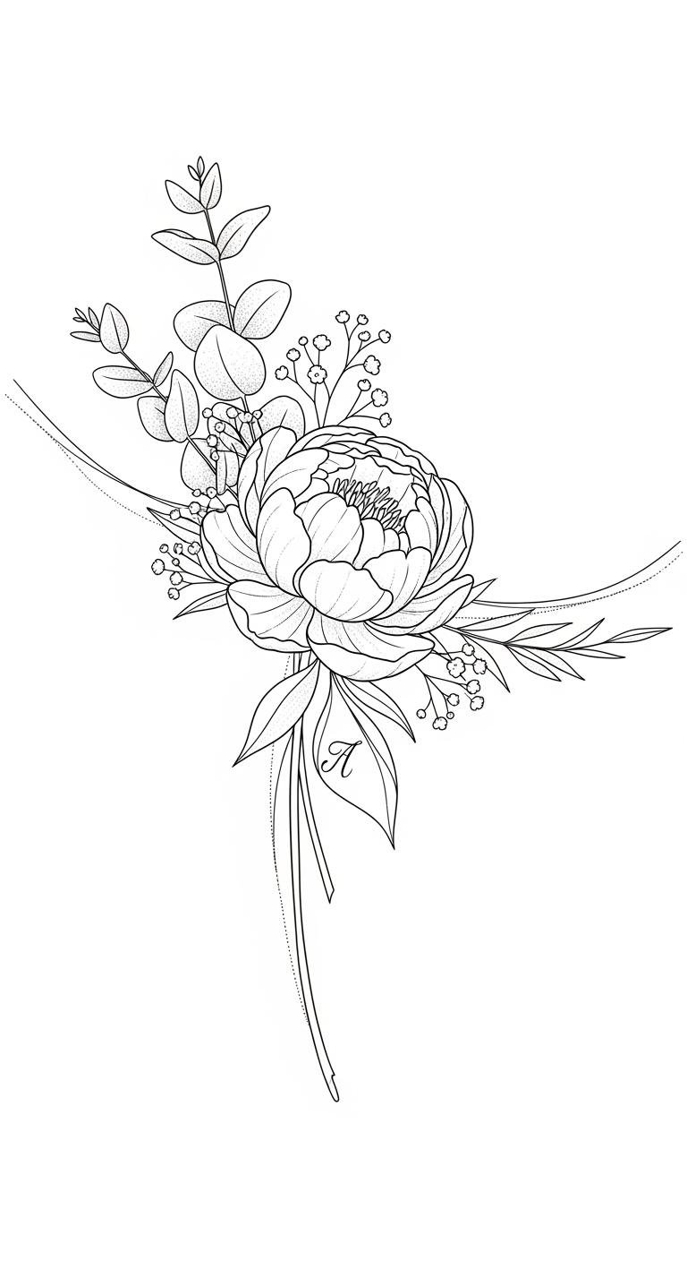 This concept emphasizes resilience and personal heritage—roses for love and remembrance, peonies for prosperity and healing—rendered in stark black to convey strength and clarity; emotionally it reads as both protective and celebratory, a visual anchor for identity.