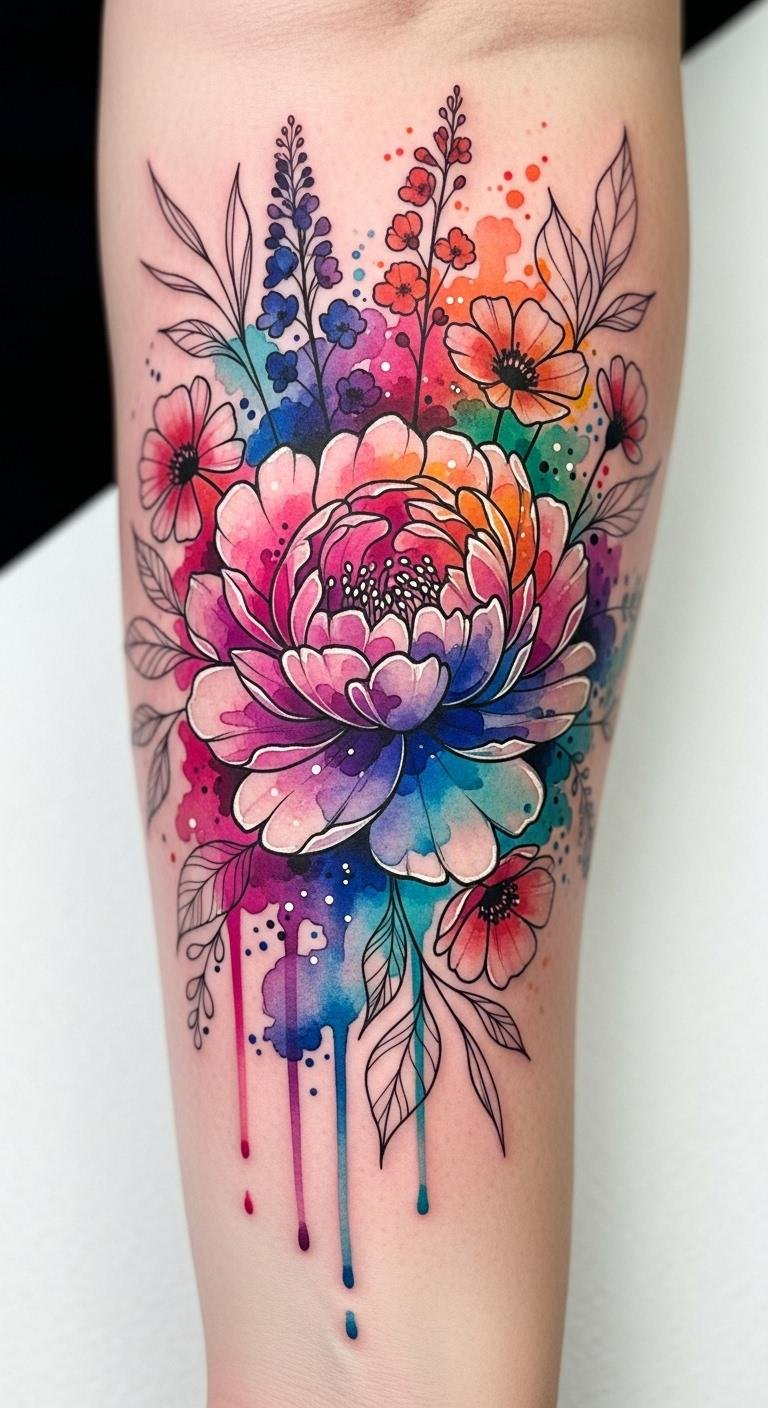 Using innovative watercolor techniques, these tattoos showcase vibrant palettes that blend colors seamlessly, allowing you to express your individuality. Embrace the artistic freedom of watercolor flowers and let your skin become a living masterpiece.
