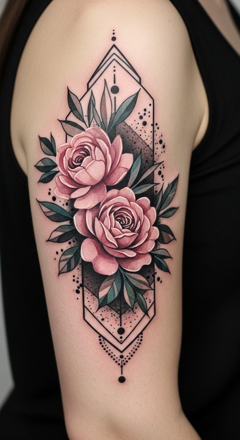A sleek forearm or upper back piece blending soft watercolor washes with crisp geometric lines symbolizes the balance between spontaneity and control; the watercolor petals evoke emotional fluidity and personal freedom while the geometric lattice anchors the composition with clarity and modernity. This placement allows for visibility and concealment as desired, conveying confidence and individuality; emotionally it represents harmony between tradition and innovation, making it a contemplative statement about identity, cultural roots, and the wearer’s evolving narrative.