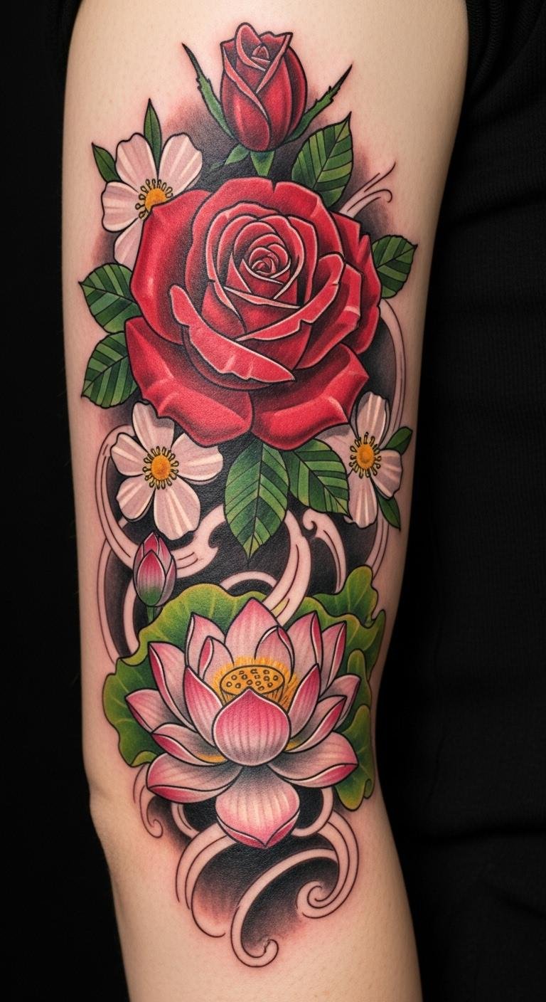 This design concept blends a bold red rose and a calm lotus in a single flowing composition: the rose rendered with realistic shading and subtle thorns, the lotus in fine linework with soft watercolor washes, connected by a vine that incorporates small regional motifs (e.g., Americana stars, Asian wave patterns). Symbolically it unites passion and serenity, heritage and individuality; emotionally it conveys balance, pride, and personal freedom. Ideal placements include the upper arm or ribcage for a medium piece, or along the shoulder blade for a larger, horizontally oriented version.