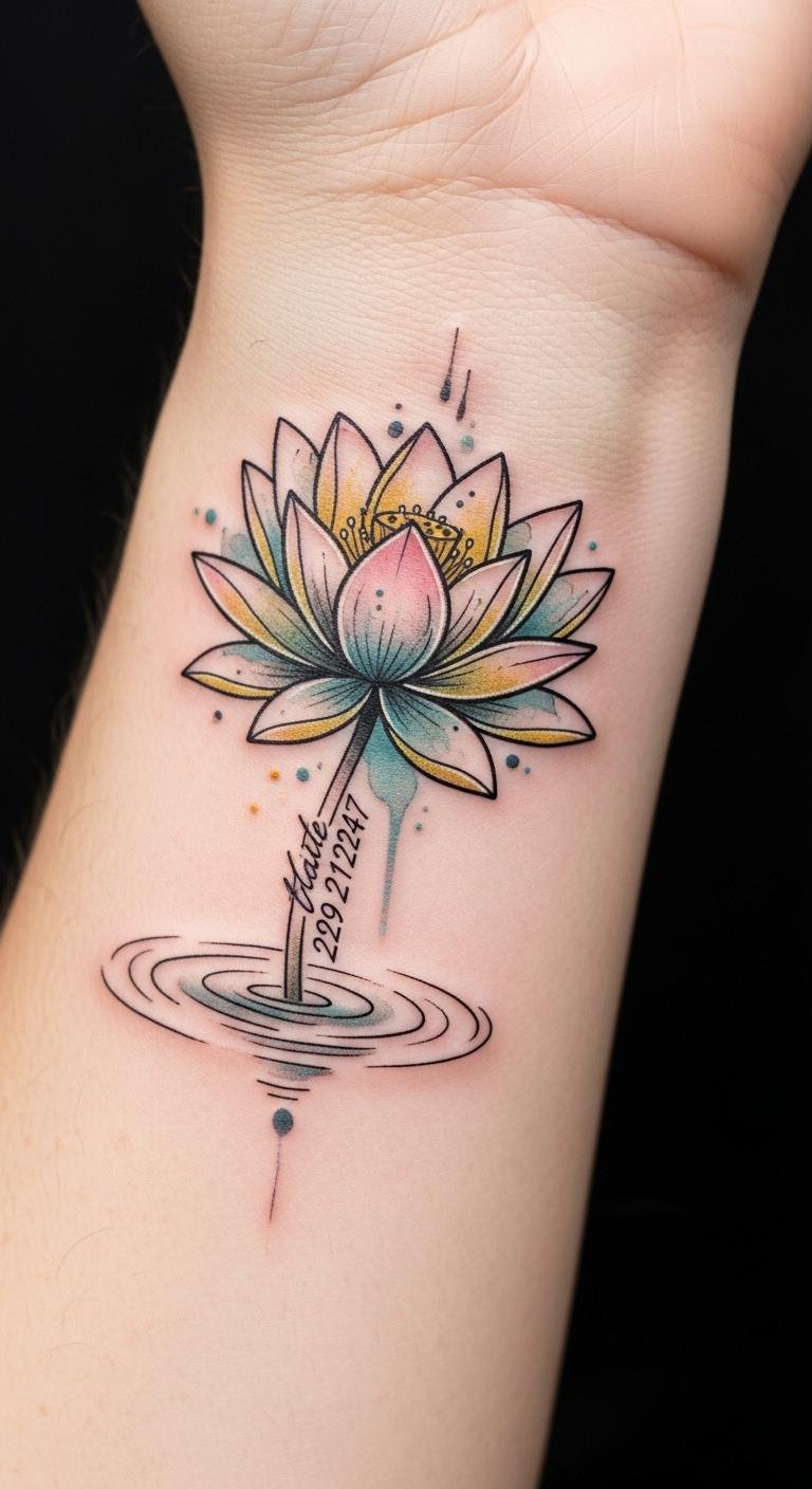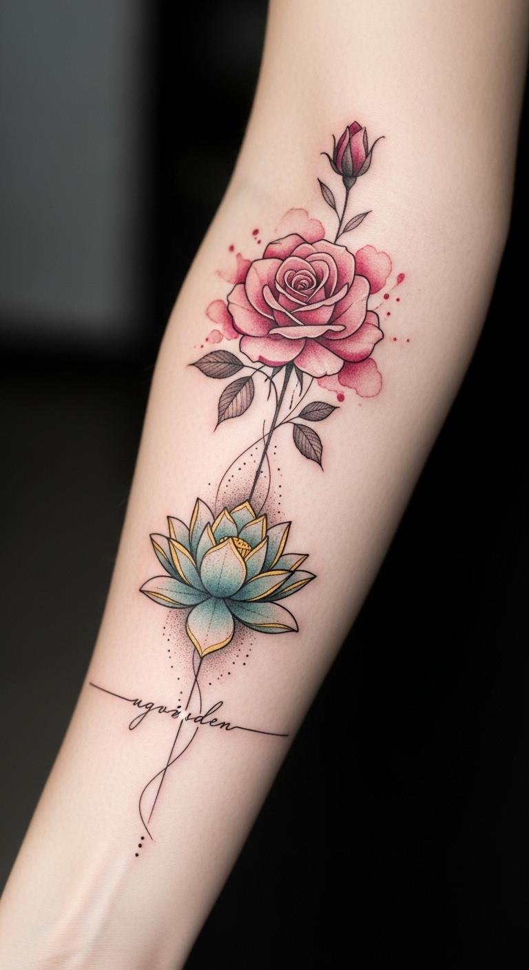 This forearm placement highlights the emotional interplay between love and renewal; the rose evokes passion and memory while the lotus signifies growth from hardship, the intertwining vines representing continuity, and the soft watercolor palette conveying tenderness and resilience—ideal for someone who wants a visible, graceful reminder of transformation and cherished relationships.