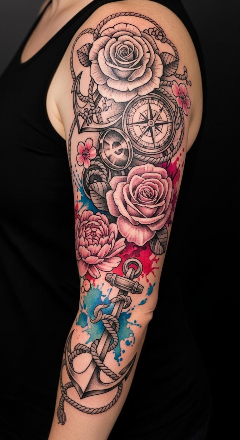 As you explore the intricate tapestry of floral tattoos, you’ll find their roots run deep in history, blossoming from the traditions of sailors in the 18th century. These tattoos carry historical significance, reflecting cultural influences that shaped their evolution. From simple roses symbolizing love to modern, vibrant interpretations, floral tattoos celebrate life’s beauty, encapsulating stories that resonate across generations and defy boundaries. The design fuses historical sailor motifs with contemporary florals to symbolize journey, love, resilience, and personal growth; emotionally it balances nostalgia and renewal, making it suitable for a 3/4 sleeve or upper arm placement where the flow can wrap the biceps and shoulder, allowing the vintage elements to anchor near the inner arm and the watercolor blooms to unfold toward the outer arm and shoulder.