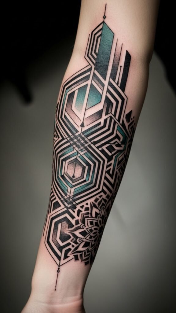 While floral designs offer a gentle touch of nature, abstract geometric patterns release a bold expression of individuality and creativity. You can embrace geometric symmetry and vibrant contrasts, transforming your skin into an electrifying canvas. Each sharp line and intricate shape speaks volumes about your unique journey, celebrating freedom and self-discovery.
