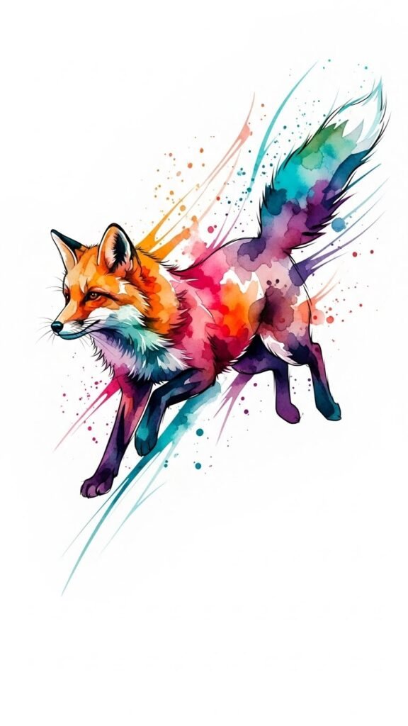 A flowing watercolor fox curled around a small cluster of minimalist wildflowers, with bold trash polka splashes behind it to add contrast; placed along the outer forearm or upper shoulder blade to follow natural lines. Symbolically the fox represents adaptability and cleverness, the wildflowers convey growth and resilience, and the watercolor palette evokes emotional depth and freedom; the trash polka elements inject boldness and rebellion. Emotionally this piece balances vulnerability and strength, making it ideal for visible placements where it can be a daily reminder of personal transformation and inner spirit.