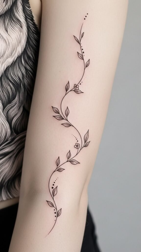 A minimalist vine and leaf design symbolizes growth, resilience, and serenity; the fine lines and tiny blossoms evoke quiet elegance and personal transformation, making it feel intimate and freeing.