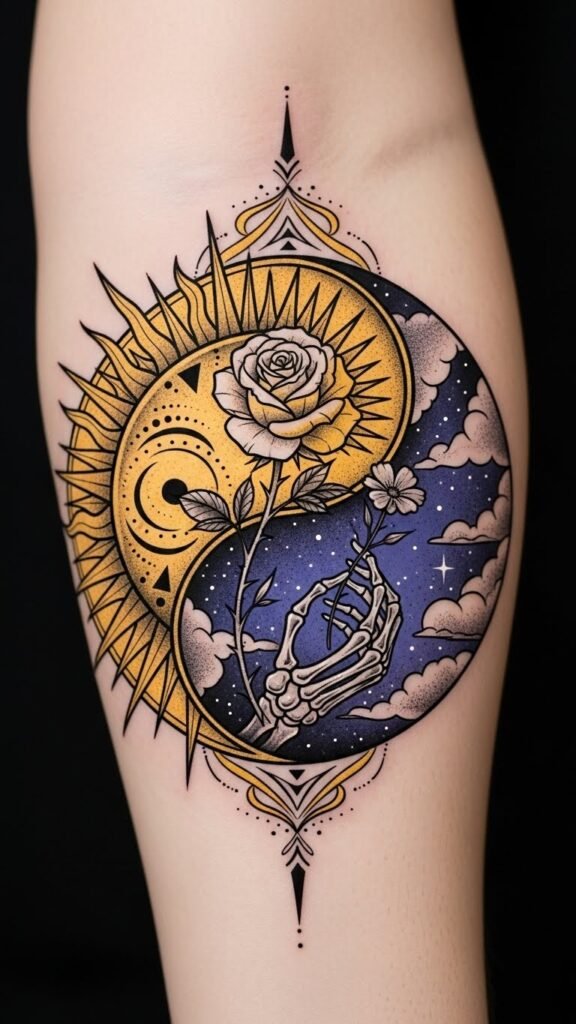 Imagine the yin yang, where light dances with shadow, embodying balance and harmony. A sun and moon tattoo captures chaos and order, while life intertwines with death.