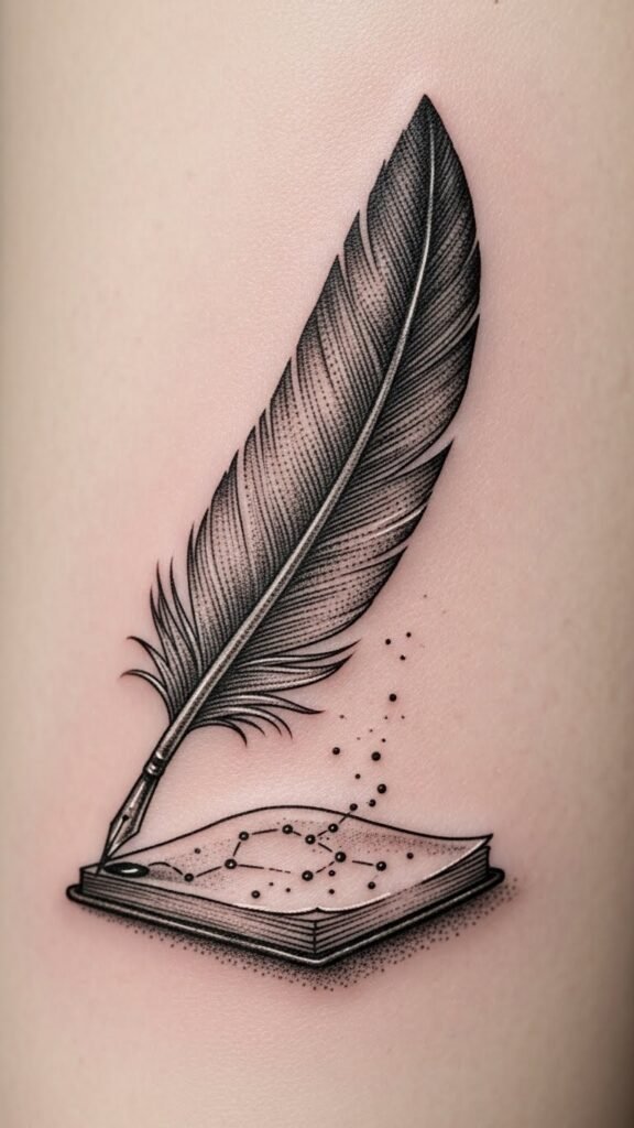 The quill feather and miniature book page symbolize personal narratives and the power of words—each ink droplet-constellation links memories to guiding moments, suggesting stories that map your inner sky.
