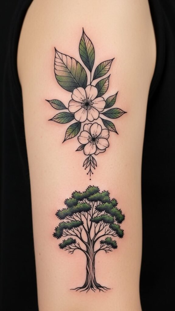 A flowing forearm or shoulder piece featuring a stylized tree whose roots morph into delicate flowers and leaves, rendered in earthy greens and muted browns with subtle white highlights to mimic sustainable ink; small birds or a crescent moon can be integrated to add movement.
