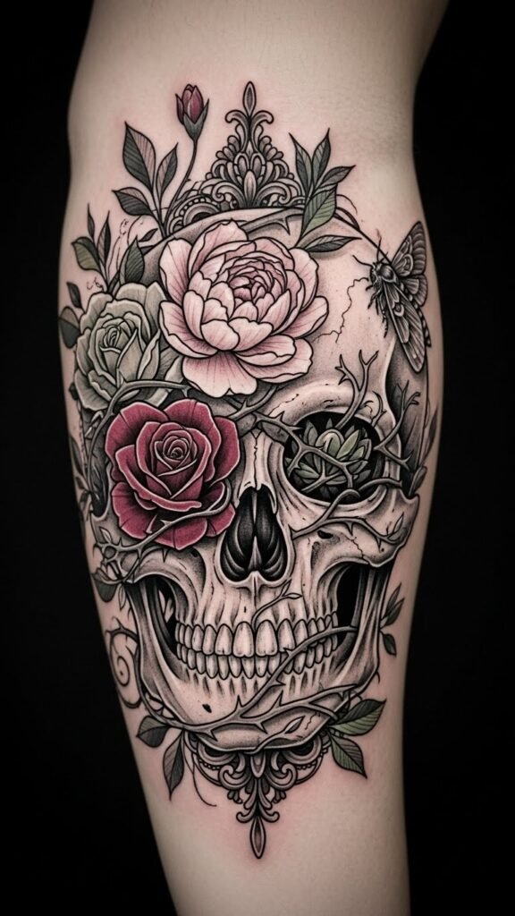 The design symbolizes the balance between mortality and rebirth, evoking bittersweet beauty and resilient grace; emotionally it reads as contemplative yet defiant, ideal for placement along the forearm or wrapping around the thigh where the flowing vines and contours of the skull can follow the body’s natural lines.