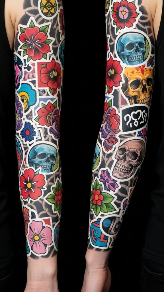 After exploring the striking contrast of hybrid floral and skull tattoos, you might find yourself drawn to the playful and eclectic world of sticker sleeve patchwork designs.