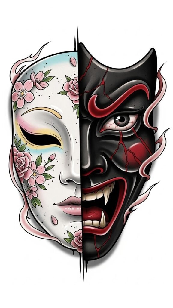 Embracing mask symbolism, these tattoos beautifully showcase serene contrasts between joy and sorrow, inviting you to wear your feelings boldly, transforming your body into a striking narrative of freedom and individuality.