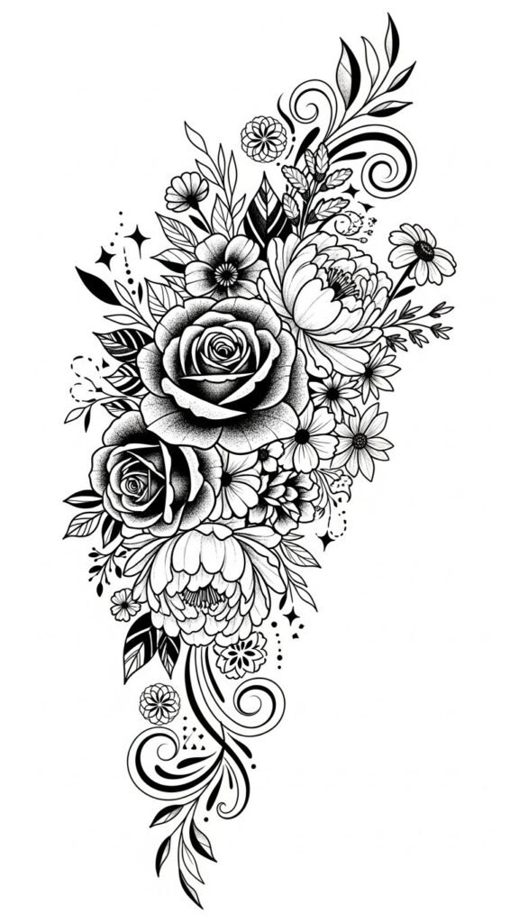 These intricate patterns celebrate nature’s resilience, allowing you to express your freedom and individuality in a powerful, artistic way. The composition’s dense black silhouettes and delicate dotwork create a visual balance between boldness and fragility—symbolizing resilience, inner strength, and personal growth—ideal for placement along the forearm or rib cage where the vines can follow the body’s natural curves and evoke movement and protection.