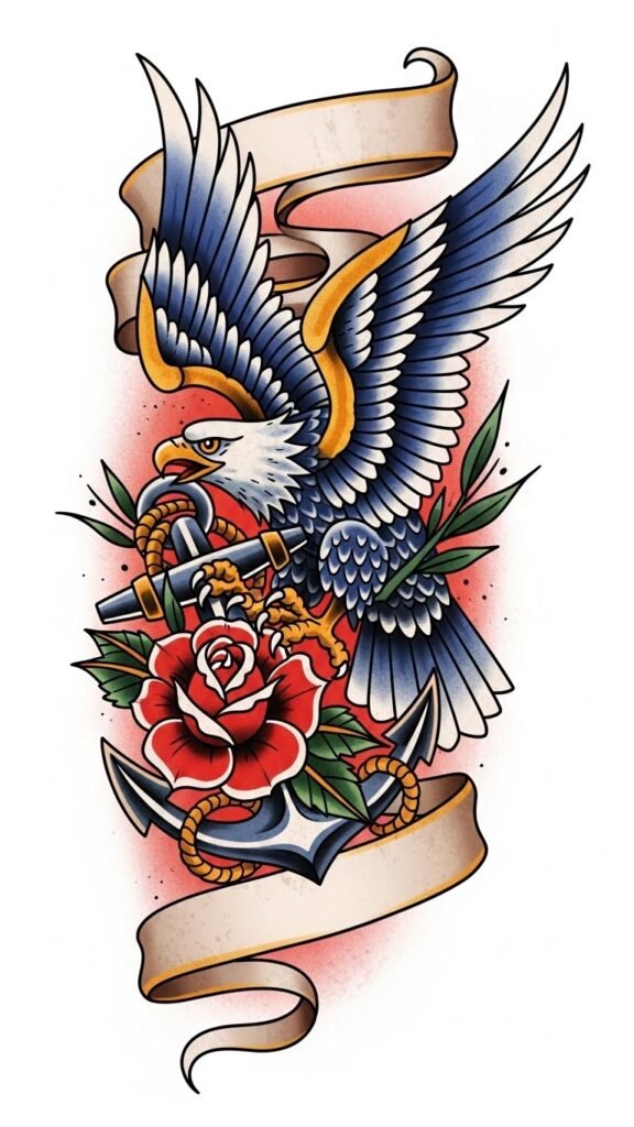 A compact upper-arm piece combining the eagle, anchor, rose, and banner conveys freedom (eagle), steadfastness (anchor), and passionate memory (rose), with the ribbon left blank for a personal name or date; the strong classic lines and saturated palette evoke nostalgic, rebellious energy while readable at a distance, making it ideal for curved musculature on the deltoid where it can wrap modestly toward the shoulder and sleeve—suitable for someone who wants a visible, emotive statement that references heritage and personal story.