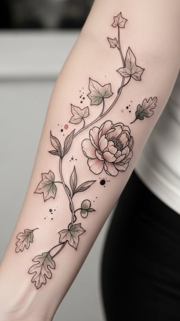 This forearm placement lets the ivy represent resilience and continuity as it winds with your arm’s motion, the peony embodying personal transformation and cherished moments, and the oak leaves grounding the piece with strength and heritage; together the composition evokes tenderness and endurance, suited for someone who wants a visible yet graceful reminder of growth and connection.