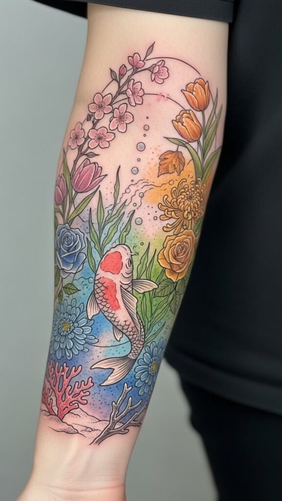 Embrace blossoming art and seasonal blooms to celebrate the life cycle and the botanical significance of your journey. This design blends aquatic resilience and floral cycles to evoke continuous growth and personal transformation; the koi symbolizes perseverance and rebirth while the progressive flowers represent seasons of life, making the forearm or calf ideal placements for visibility and movement—areas that allow the imagery to flow with muscle motion and invite conversation about one’s evolving story.