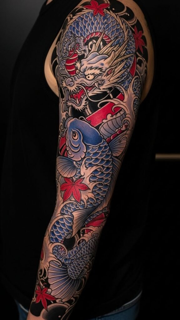 The design symbolizes perseverance (koi) transforming into power and wisdom (dragon), balanced by flowing water and falling maple leaves to evoke change and time; emotionally it blends resilience and boldness with contemplative grace, suited for a full sleeve that wraps the arm to follow muscle contours and motion, allowing the composition to read in movement and stand out from several feet away.
