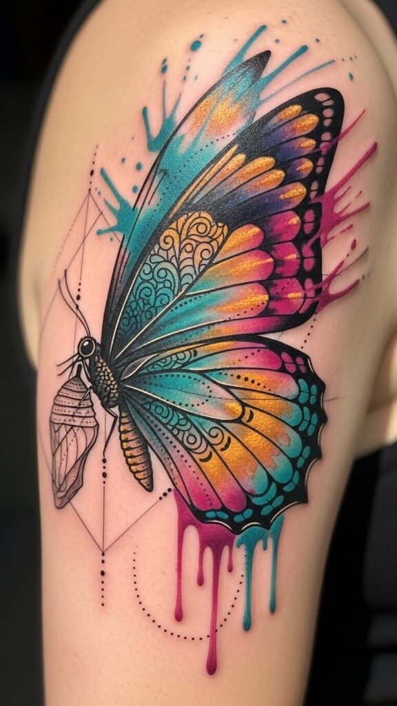 These tattoos embody colorful metamorphosis, reflecting your growth and resilience. With intricate patterns and vibrant hues, they embrace butterfly symbolism, inviting freedom and renewal.