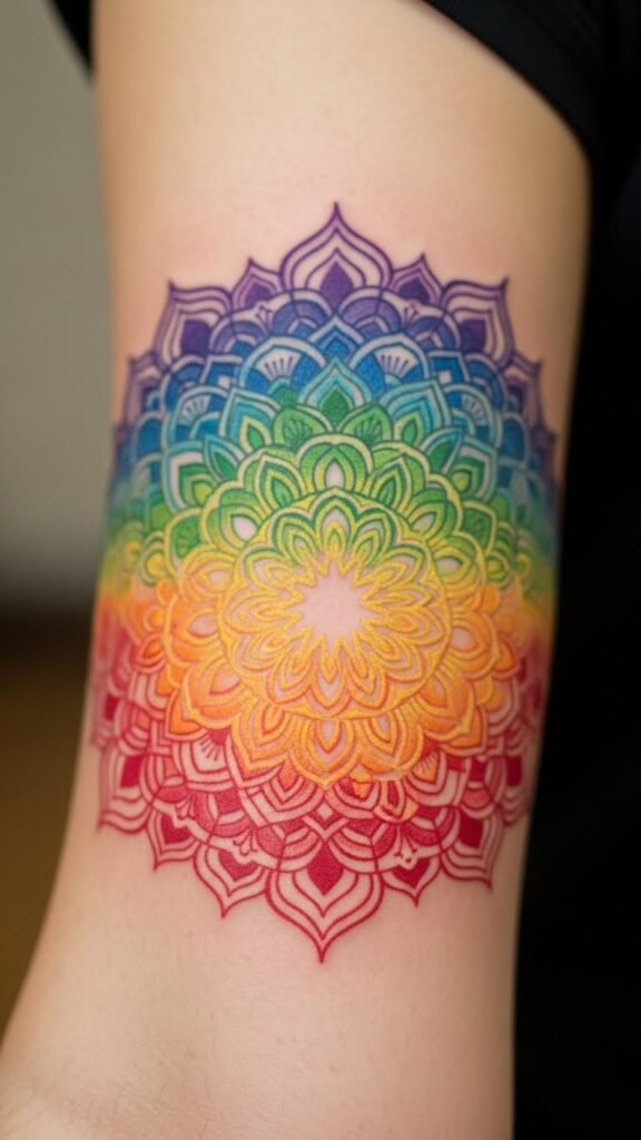 This tattoo concept uses the existing text as the visual and thematic blueprint: concentric mandala rings rendered in saturated rainbow gradients, center motif echoing unity symbols, fine line symmetry for a meditative feel; ideal sizes for forearm wrap, upper back, or chest panel. Symbolically it represents completeness and the awakening of inner creativity; the color transitions evoke emotional freedom and joy while the precise symmetry fosters calm and centering. Placement suggestions emphasize visibility for personal affirmation (forearm, chest) or a larger contemplative space (upper back).