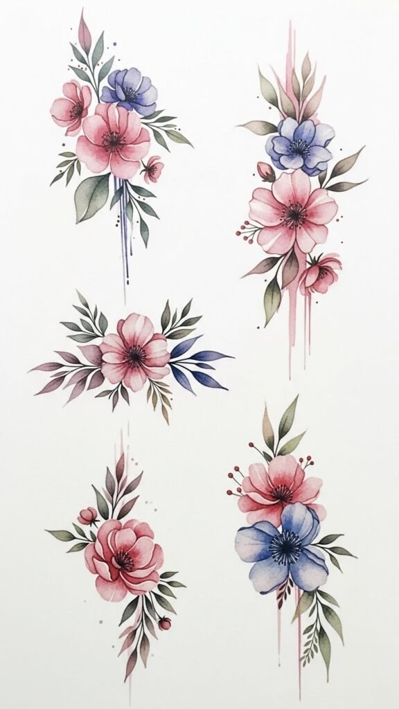 Soft pastel washes of roses, peonies, and wildflowers blend into a trailing vine that curves along the forearm or collarbone, splashes of cobalt and magenta bleeding gently beyond fine black ink outlines; delicate droplets and brushstroke textures suggest motion and impermanence, with negative space forming subtle heart and leaf shapes.