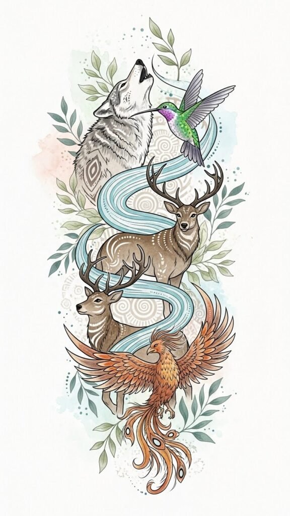 Your tattoo can be a powerful statement for freedom and connection. The design symbolizes resilience (phoenix), guidance and loyalty (wolf), joy and healing (hummingbird), and nobility and renewal (stag); emotionally it conveys reverence, protection, and hopeful activism, intended for placement across the upper back or along the ribs where the flowing river negative space accentuates body movement and allows each animal’s gesture to breathe.