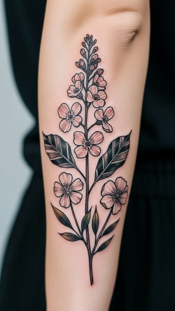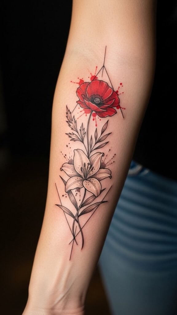 From the fiery passion of a red poppy to the gentle grace of a lily, these tattoos embody birth flower meanings that resonate deeply. You can play with seasonal flower choices, creating a design that reflects your personality and the essence of your unique journey.