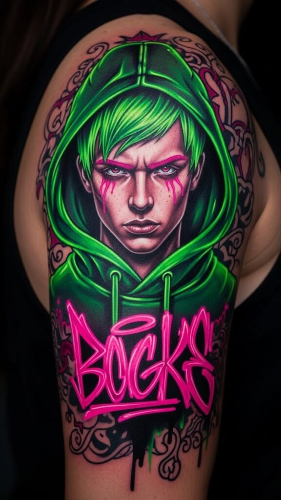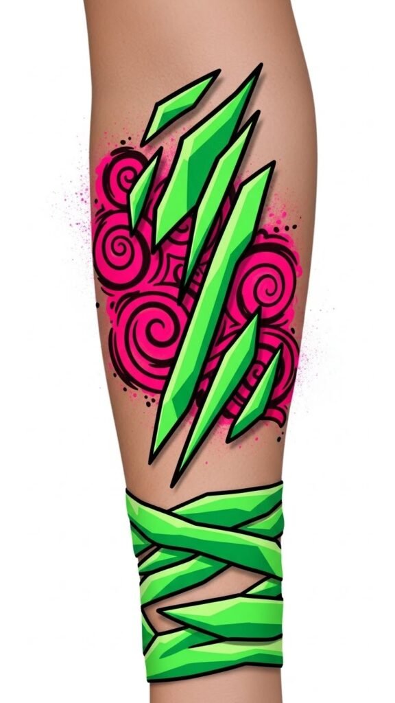 This design pairs sharp neon-green geometric shards with flowing hot-pink graffiti swirls to symbolize the balance of structure and spontaneity — bold rebellion softened by playful vibrancy.