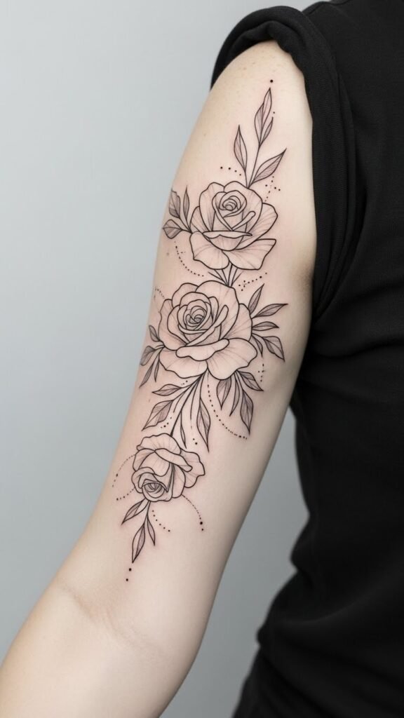 This design symbolizes both passionate energy and serene elegance, evoking resilience, remembrance, and purity; emotionally it balances boldness with tranquility, making it suited for a visible placement like the forearm or along the ribcage where its flowing composition follows the body’s natural lines.