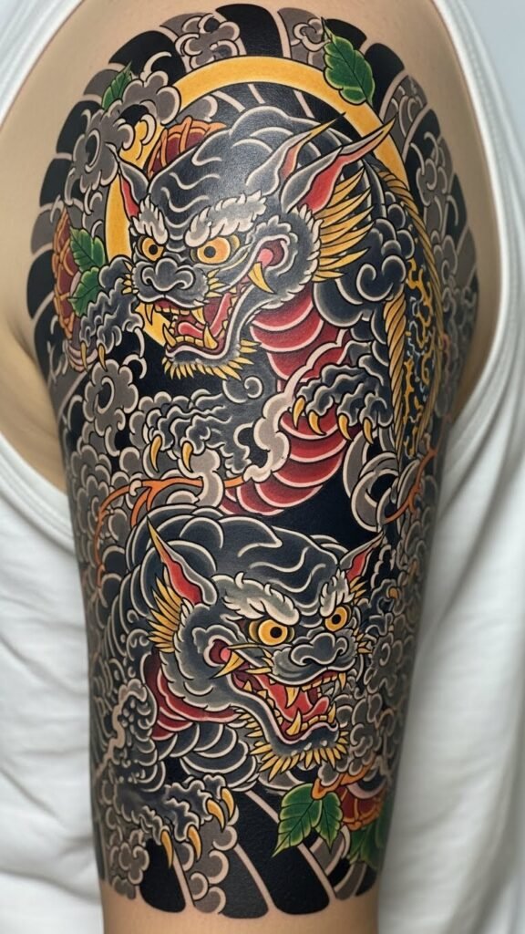 This design concept envisions a full-color Japanese Irezumi sleeve centered on a phoenix entwined with maple leaves, koi, and stylized waves, using sumi-style outlines filled with saturated reds, indigos, golds, and emeralds; symbolism blends rebirth, perseverance, and the flow of life, evoking resilience and renewal while honoring traditional craftsmanship. Emotionally the piece should feel empowering and contemplative, balancing dynamic movement with serene background elements; place it on the upper arm extending to shoulder and chest for a flowing narrative that reads well from multiple angles and complements body contours.