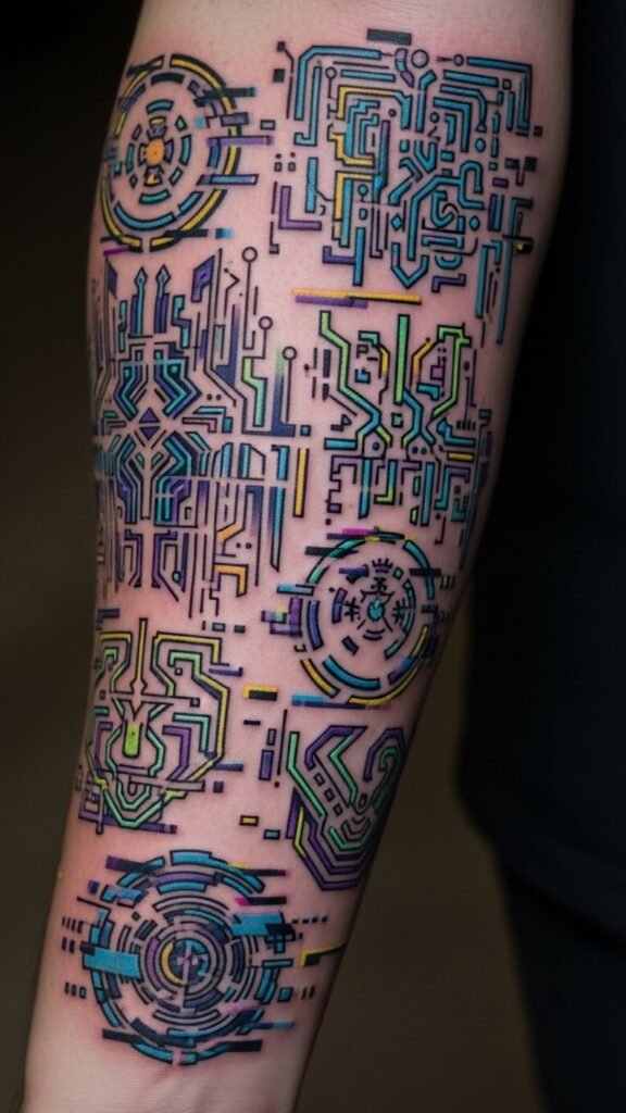 This design places a looping sigil rendered in fractured neon lines across the forearm, the glitches suggesting movement between realities; colors shift from electric cyan to magenta in staccato pulses, evoking both digital interference and ecstatic release.