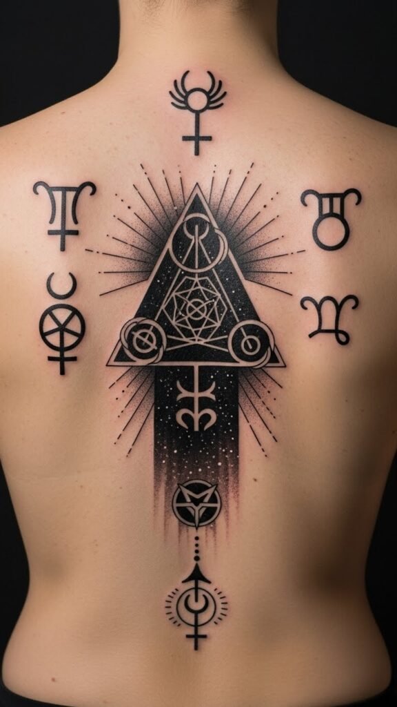 This design channels inner strength and clarity through sharp geometry and deliberate negative space; it evokes focus and transformation while the spine-like axis suggests personal alignment—ideal for a forearm wrap for daily visibility or centered on the upper back for a more private, grounding statement.