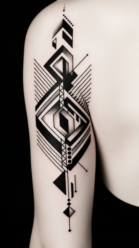 You’ll find geometric patterns intertwining, forming a striking visual language that speaks to your free spirit. Embrace the boldness of angular aesthetics, where each line tells a story, inviting you to express your individuality and ignite a passion for innovative design in your tattoo journey.