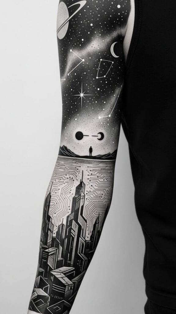 This sleeve concept uses the stark black-and-gray palette to emphasize contrasts between manmade geometry and organic cosmic forms, evoking feelings of wonder, isolation, and bold exploration; place it as a full arm wrap so the cityscape flows naturally with musculature.