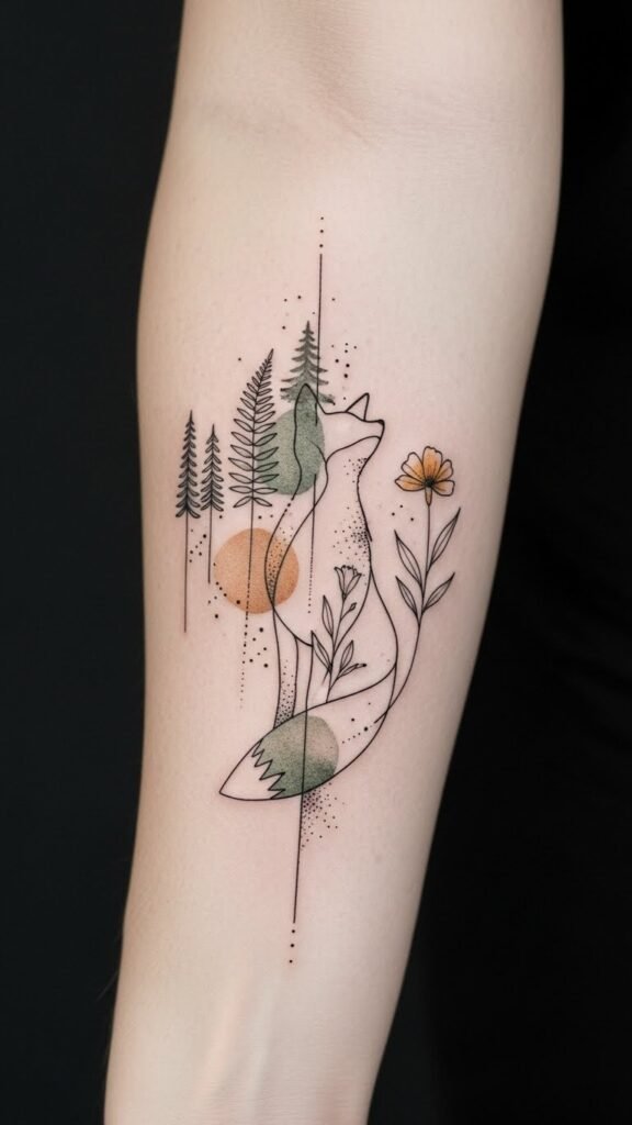 The design symbolizes harmony between the wild and the personal — the forest representing rootedness and community, the animal silhouette as instinct and individuality, and the botanical sketches as growth and renewal; emotionally it reads as quiet resilience and gentle freedom, suitable for placement on the inner forearm, behind the shoulder blade, or along the ribcage so the piece can be both intimate and visible, following the body’s natural curves to enhance movement and personal connection.