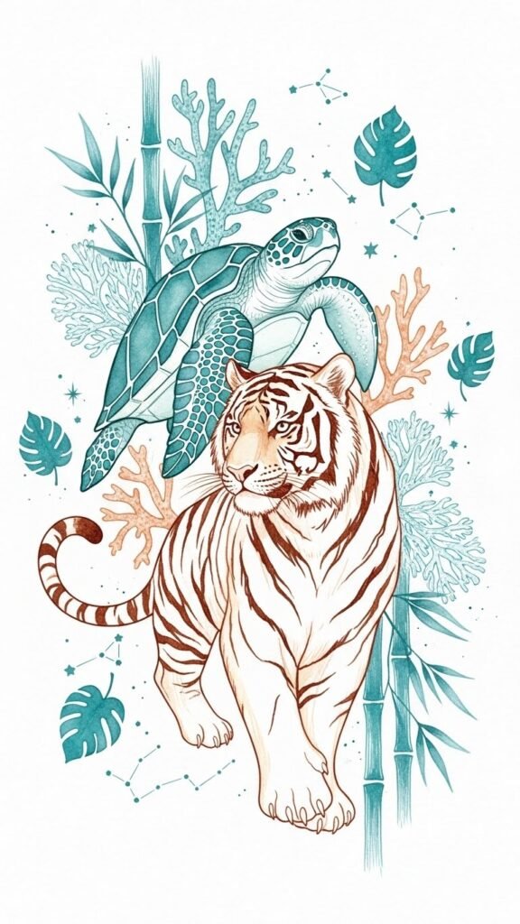 Embracing the whimsical spirit of playful motifs can lead you to a profound appreciation for the natural world, especially when considering the beauty and fragility of endangered species. Each tattoo embodies endangered species symbolism, sparking conversations about conservation awareness. Whether it’s a delicate sea turtle or a majestic tiger, these designs remind you of your connection to nature and the importance of protecting it. The design symbolizes resilience and vulnerability—the turtle’s flowing lines evoke calm endurance while the tiger’s gaze conveys strength and urgency; the surrounding coral and bamboo signify habitat and balance. Emotionally it aims to inspire stewardship and gentle pride; ideal placements include the upper arm or ribcage for a medium piece, or the shoulder blade for a slightly larger, narrative layout.