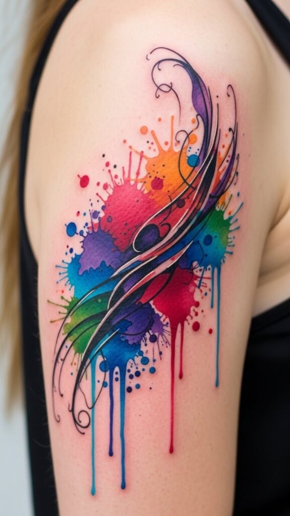 This design concept translates the evocative original text into a flowing watercolor tattoo: layered washes of turquoise, magenta, and gold bleed into one another around a central, delicate black-ink silhouette (such as a bird, tree, or abstract figure), with splatters and drips extending outward to suggest motion and spontaneity. Symbolically, the vibrant colors represent individuality and emotional richness, the loose blending conveys freedom and creative expression, and the central silhouette anchors personal identity amidst fluid change. Ideal placements include the upper arm, shoulder blade, ribcage, or calf—areas that provide enough space for the color flow and allow visibility or concealment according to the wearer’s preference.