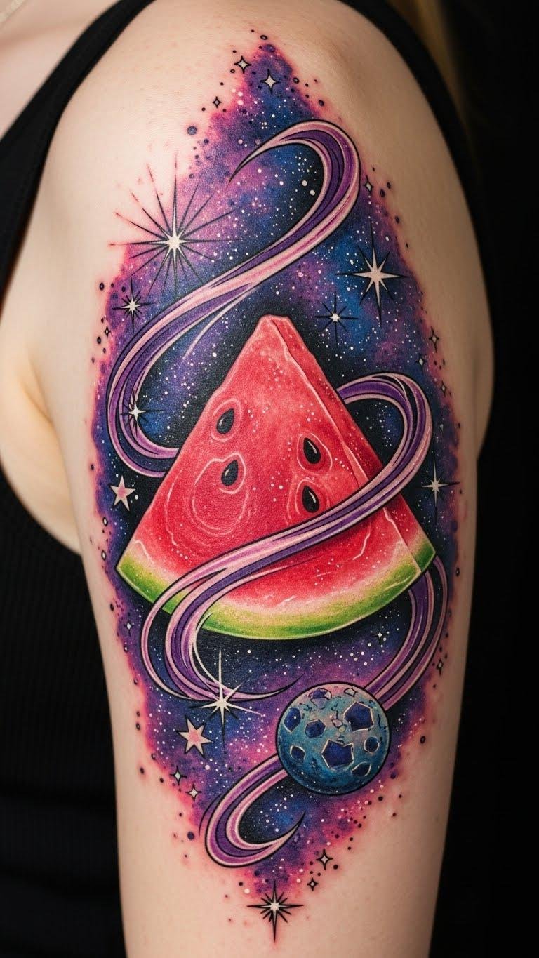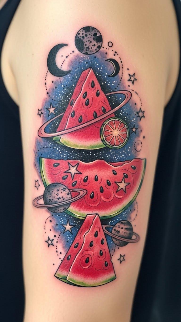 Watermelon slices overlaid with delicate stars, moons, and tiny planets symbolize the balance between simple pleasures and vast possibilities; this design evokes joy, curiosity, and a longing for exploration while honoring personal dreams.