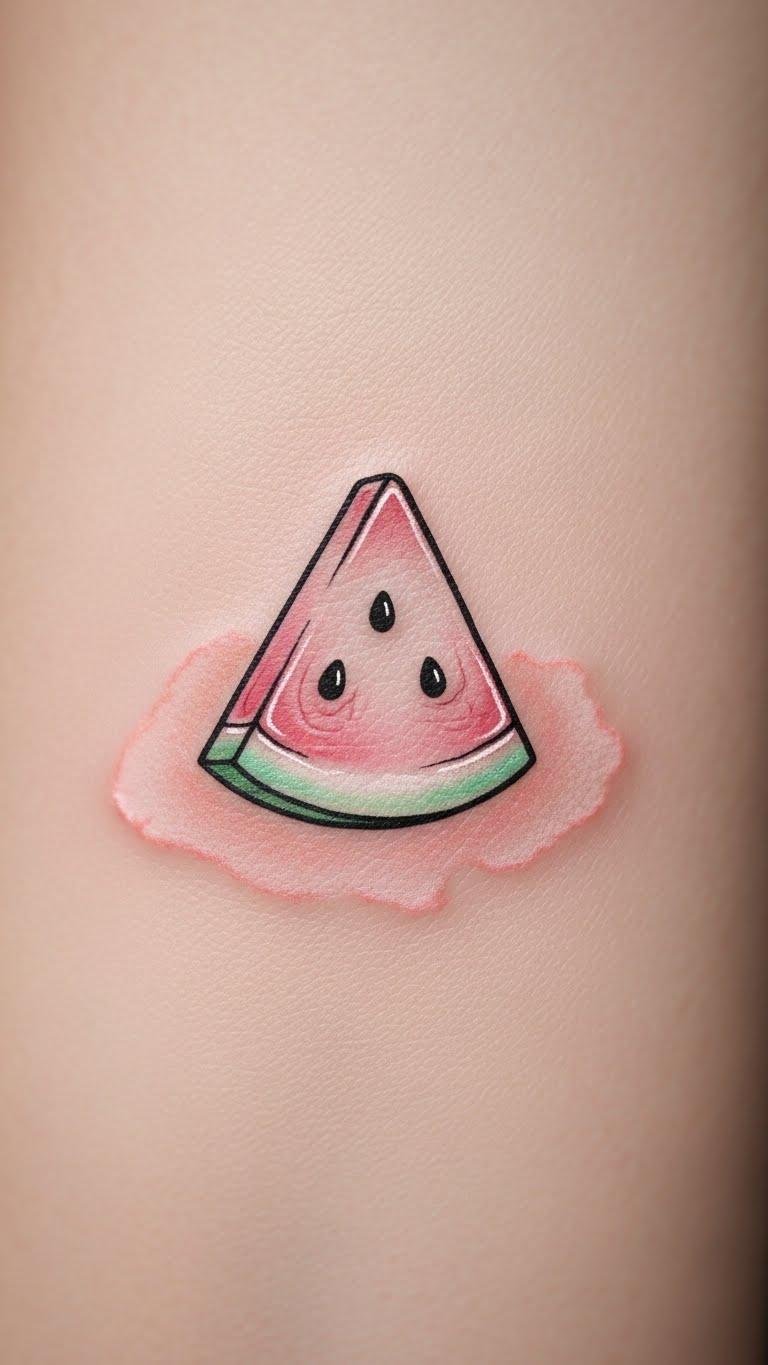 The classic watermelon slice tattoo bursts with vibrant colors and joyful symbolism, making it a favorite among tattoo enthusiasts. This design embodies classic watermelon meanings like sweetness and abundance, reminding you to savor life’s simple pleasures.