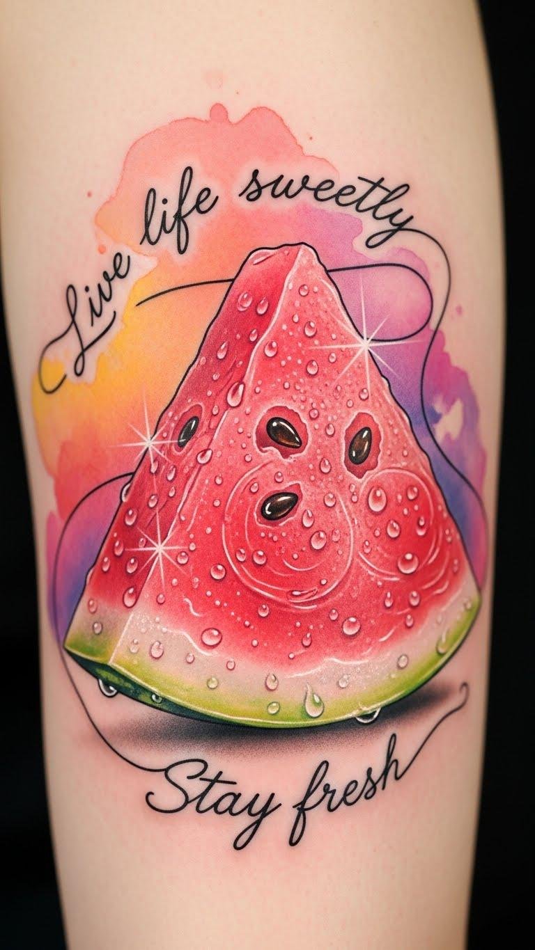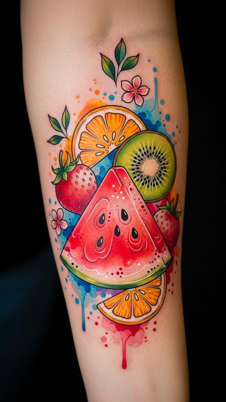 Imagine a tattoo featuring a watermelon slice intertwined with strawberries, kiwi, and citrus, embodying carefree summer days and the sweet essence of life.