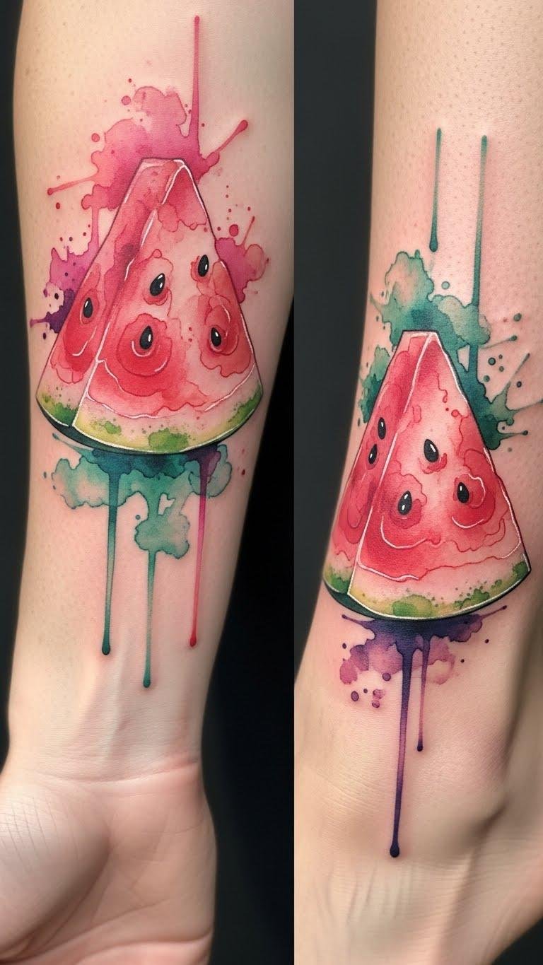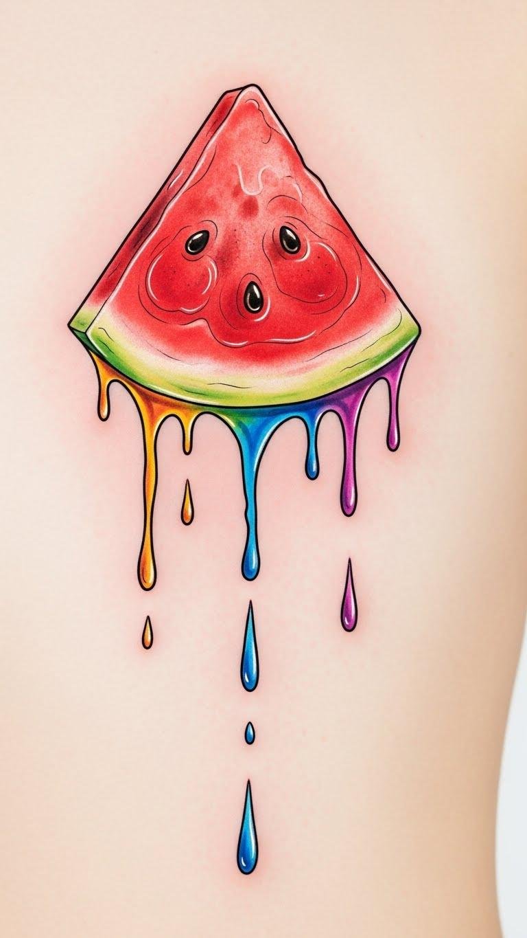 This design symbolizes abundance, playfulness, and the ephemeral nature of joyful moments; the dripping colors suggest movement and the passage of time, while the watermelon evokes nourishment and summer freedom. Emotionally it reads as lighthearted and optimistic—best placed where it can catch attention and movement, such as the forearm, ankle, or side ribcage, sized to allow the drips to flow naturally and complement body contours.