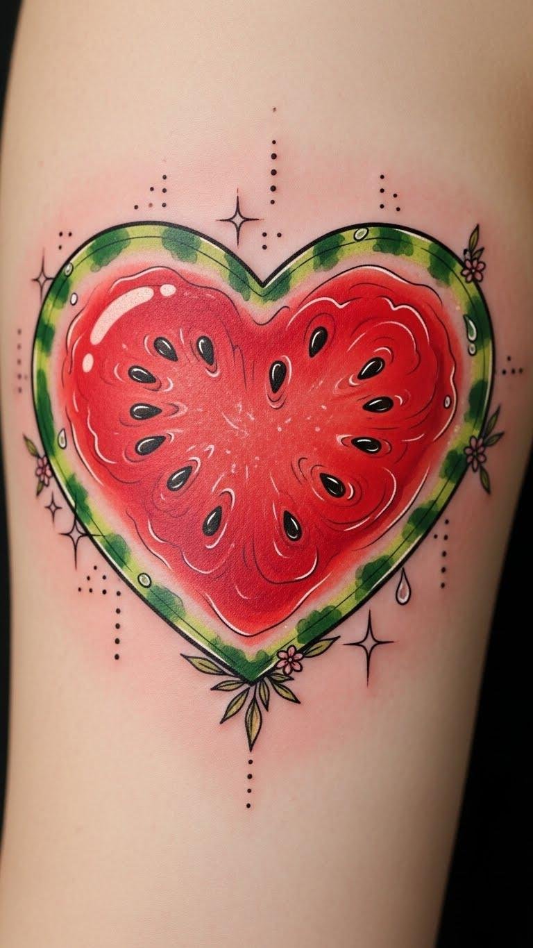 A watermelon heart tattoo beautifully merges the sweetness of love with the vibrant essence of summer.