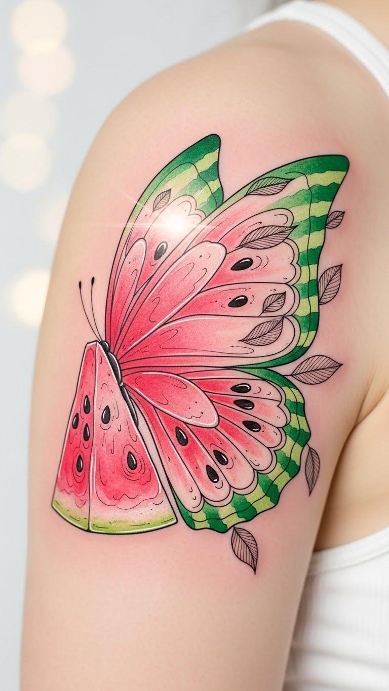 While imagining a sun-soaked day filled with laughter and joy, the idea of a watermelon tattoo adorned with butterfly elements springs to life.