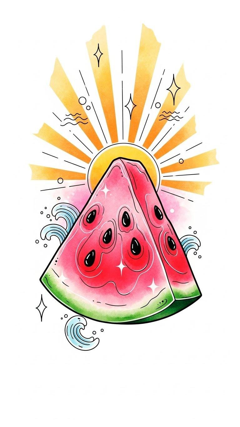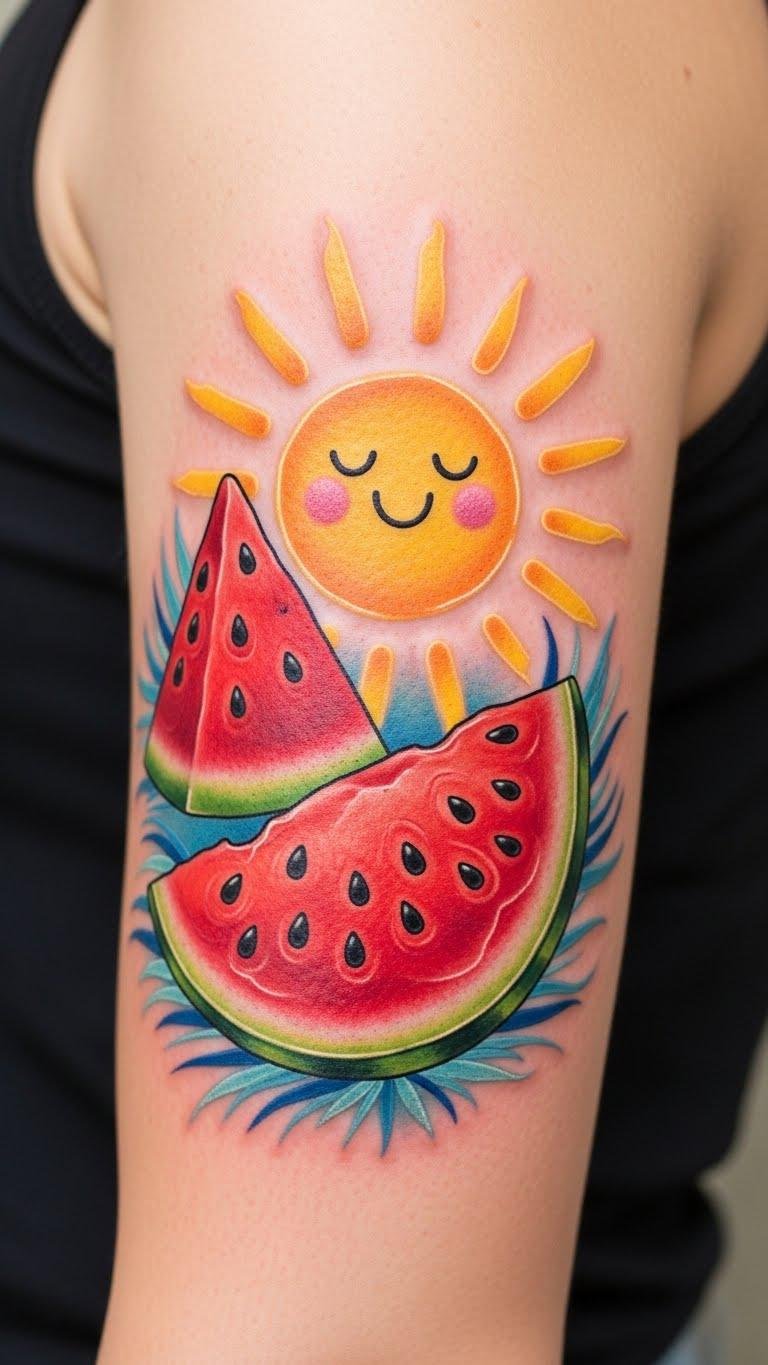 Embracing warmth, joy, and nostalgia, this design blends ripe watermelon slices with radiant sunbeams to symbolize abundance, renewal, and carefree summer energy; the bright palette evokes happiness and optimism, making it ideal for placements like the forearm, shoulder blade, or calf where movement and exposure enhance the lively colors and playful composition.