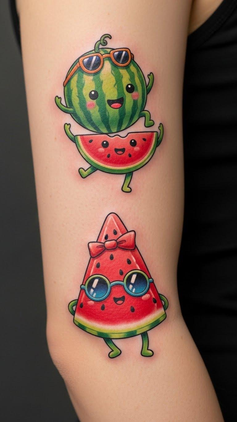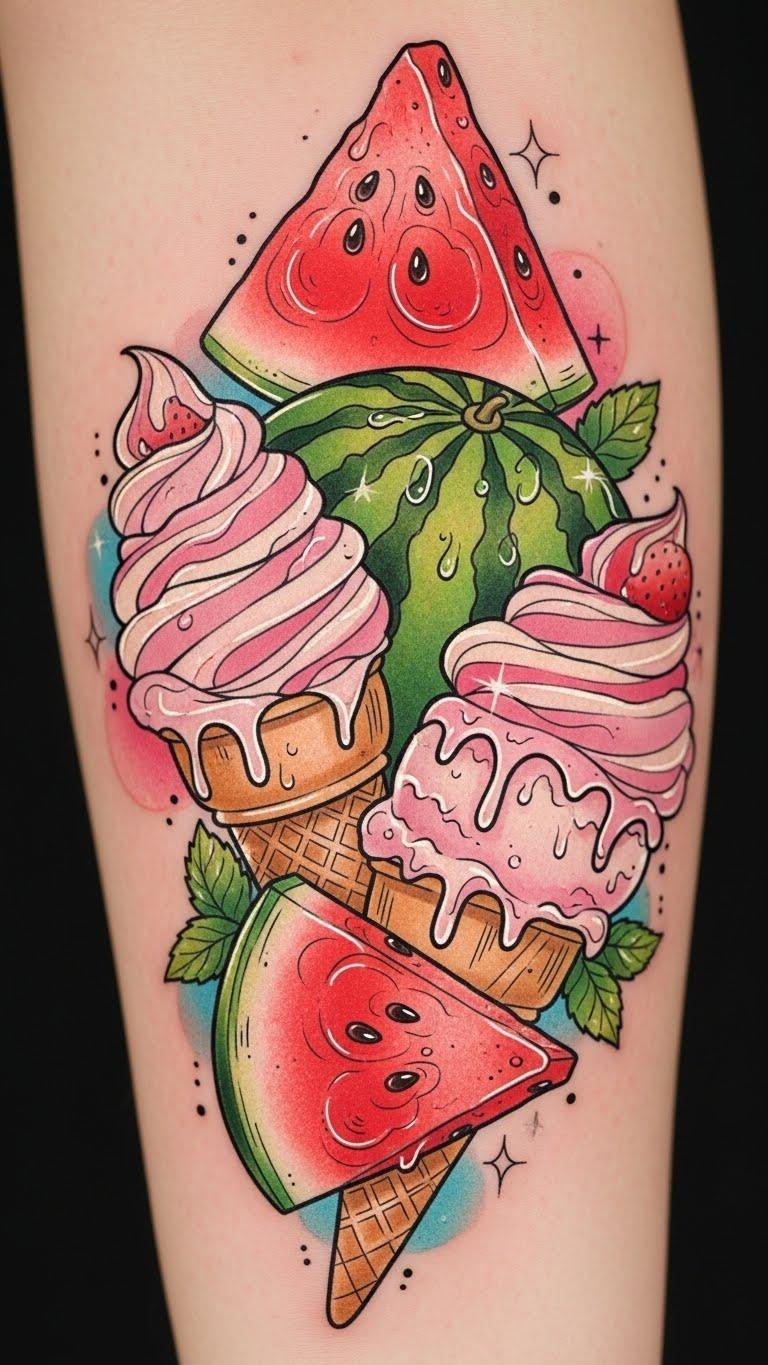 The symbolism blends abundance (watermelon) and comfort (ice cream), evoking warm nostalgia and lightheartedness; best placed on the forearm, calf, or shoulder where its cheerful energy can be easily seen and shared.