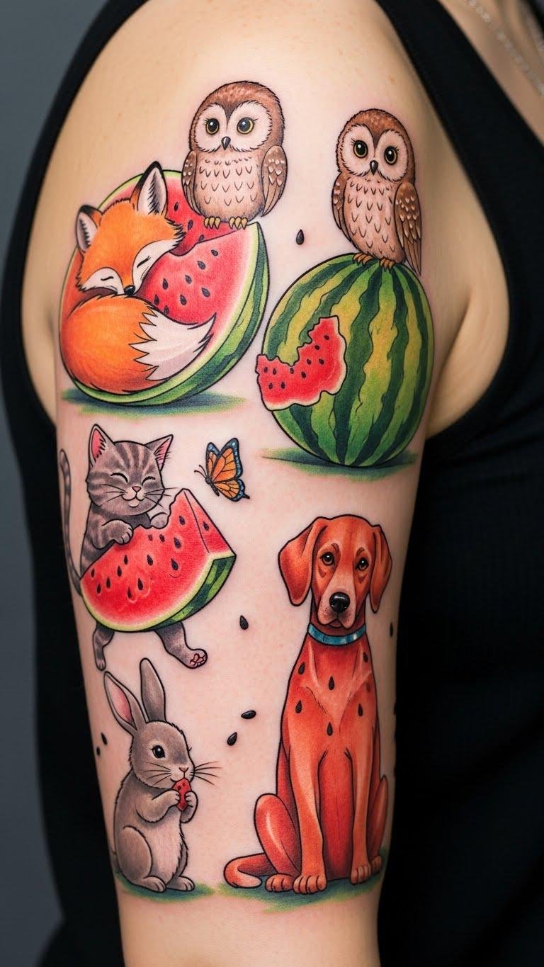 Incorporating animal companions into your watermelon tattoo can add a delightful layer of whimsy and personality to your body art. Imagine a playful watermelon fox or a wise watermelon owl perched nearby. A watermelon cat frolicking with a butterfly, a loyal watermelon dog, or a charming watermelon rabbit brings joy. You could even choose a watermelon elephant, horse, dolphin, or parrot for a vibrant, enchanting flair! The design symbolizes playfulness, companionship, and summertime abundance; it evokes warmth and lightheartedness, ideal for an outer forearm, shoulder, or calf where movement accentuates the lively characters and colors.