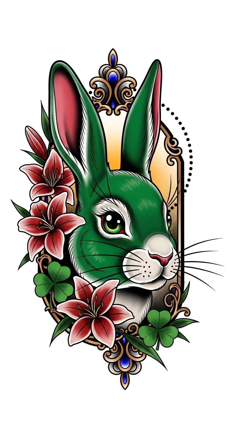 The symbolism of the bunny combined with lilies and clover evokes renewal, luck, and gentle resilience; emotionally the piece reads as both whimsical and quietly powerful, suitable for placements like the upper arm, chest, or thigh where the ornate wreath and halo can wrap and flow with the body’s contours.