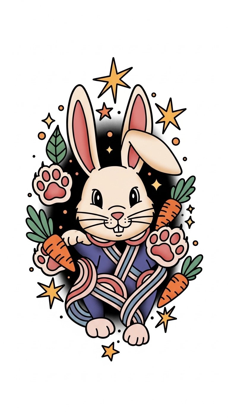This tattoo concept captures joy and a playful, adventurous spirit through the image of an adorable bunny with a carrot; its whimsical costume and lively movement symbolize childlike wonder, abundance, and a connection to nature, while the bright orange carrots against soft fur evoke warmth and vitality.