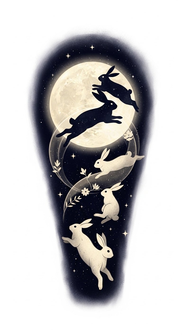 While gazing at the night sky, you might find inspiration in an enchanting rabbit and moon tattoo concept that beautifully intertwines the allure of nature with celestial magic. Imagine moonlit rabbits frolicking beneath a luminous moon, their soft silhouettes radiating tranquility. These celestial bunnies capture a sense of wonder, symbolizing freedom and dreams, inviting you to embrace your own whimsical journey through life. The design evokes peaceful curiosity and gentle motion—ideal for a forearm or calf where the rabbits can appear to move around a circular moon; soft linework, subtle dot shading, and muted grayscale with a hint of pale blue enhance the dreamy, contemplative mood and emphasize themes of protection, guidance, and personal freedom.