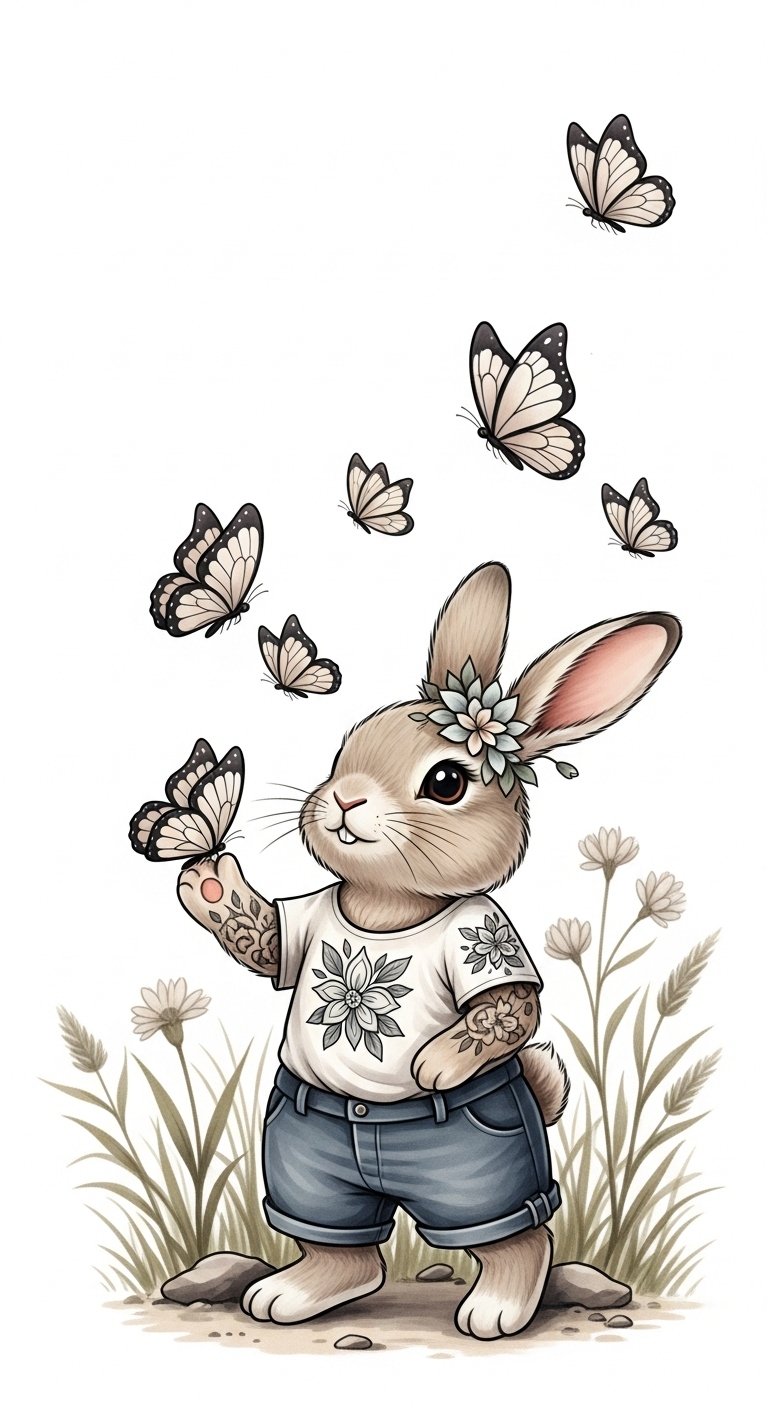 This design evokes innocence, wonder, and gentle freedom—suitable for a forearm, shoulder blade, or calf where movement can follow the body’s natural lines; the bunny represents vulnerability and warmth while the butterflies add lightness and transformation, inviting feelings of joy and connection.