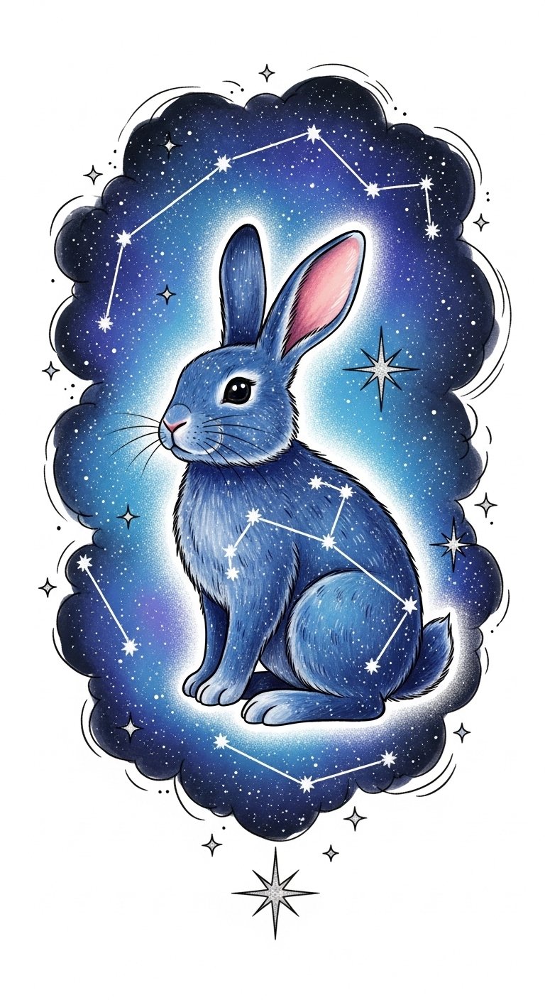 This design symbolizes liberation, curiosity, and a deep connection to the night sky; the rabbit represents gentle courage and playfulness while the constellations and shimmering palette speak to dreams, guidance, and the unknown.